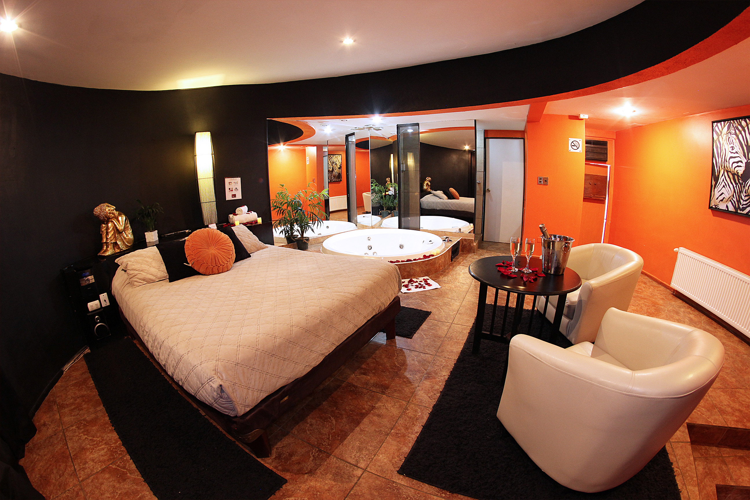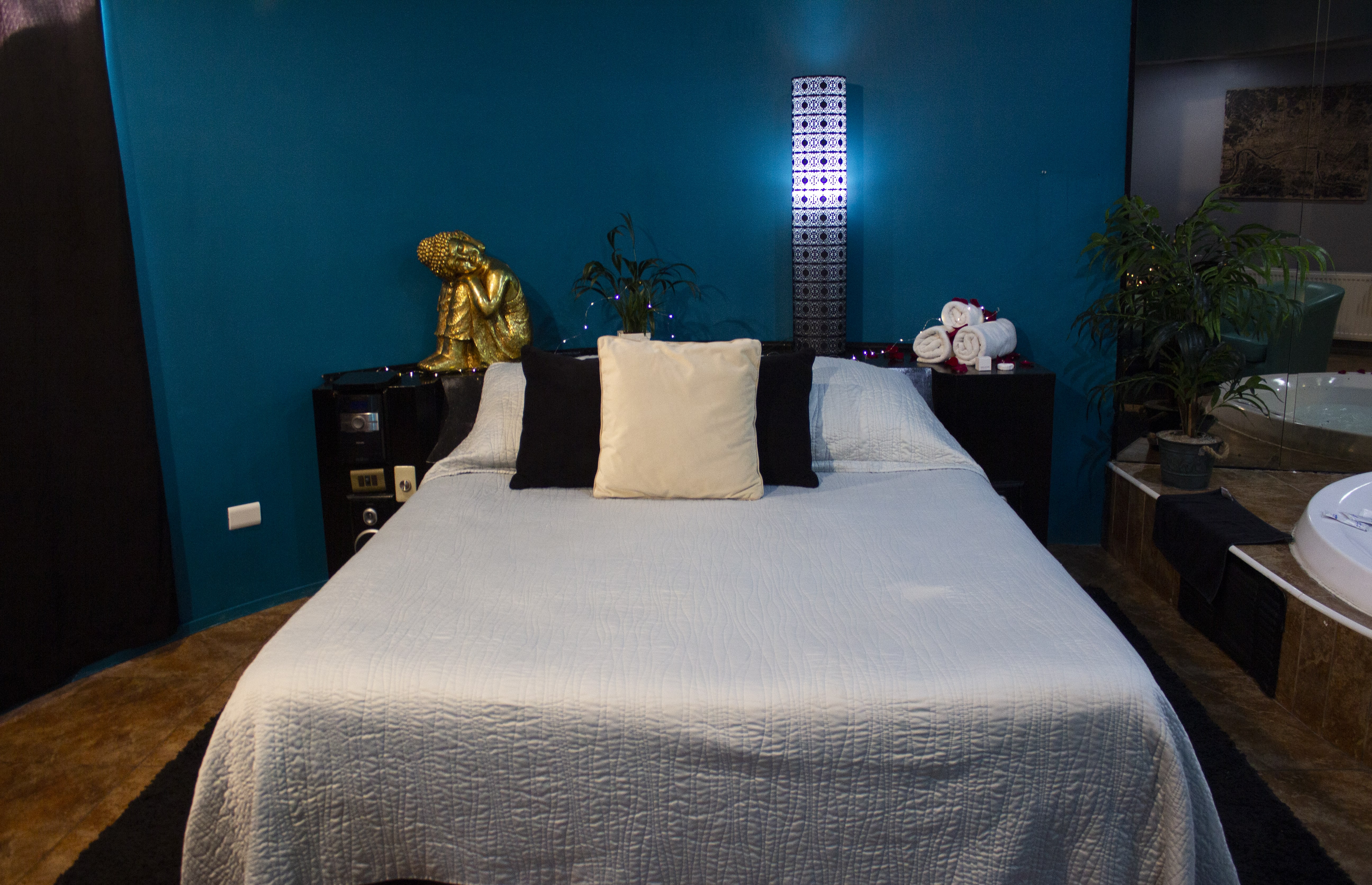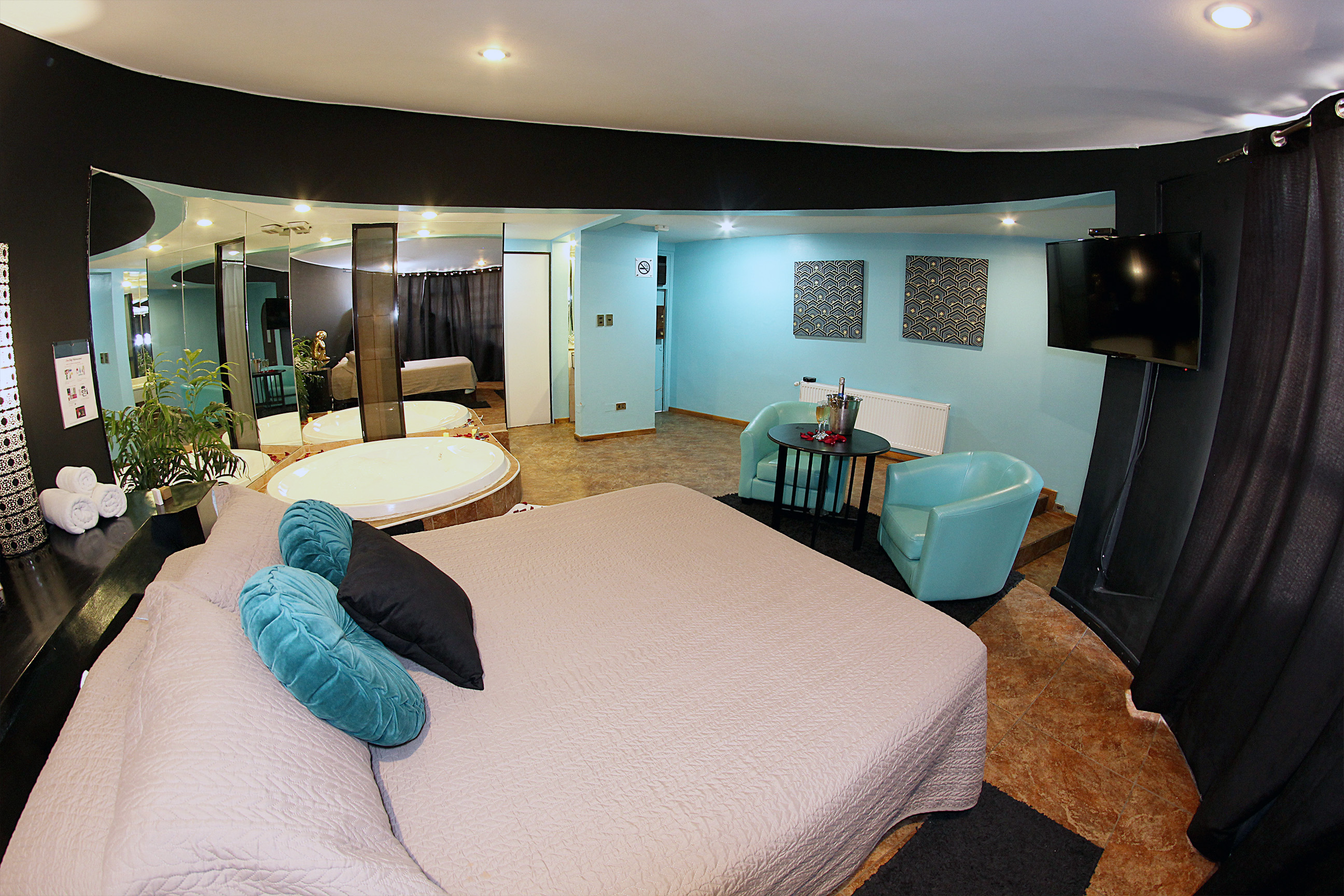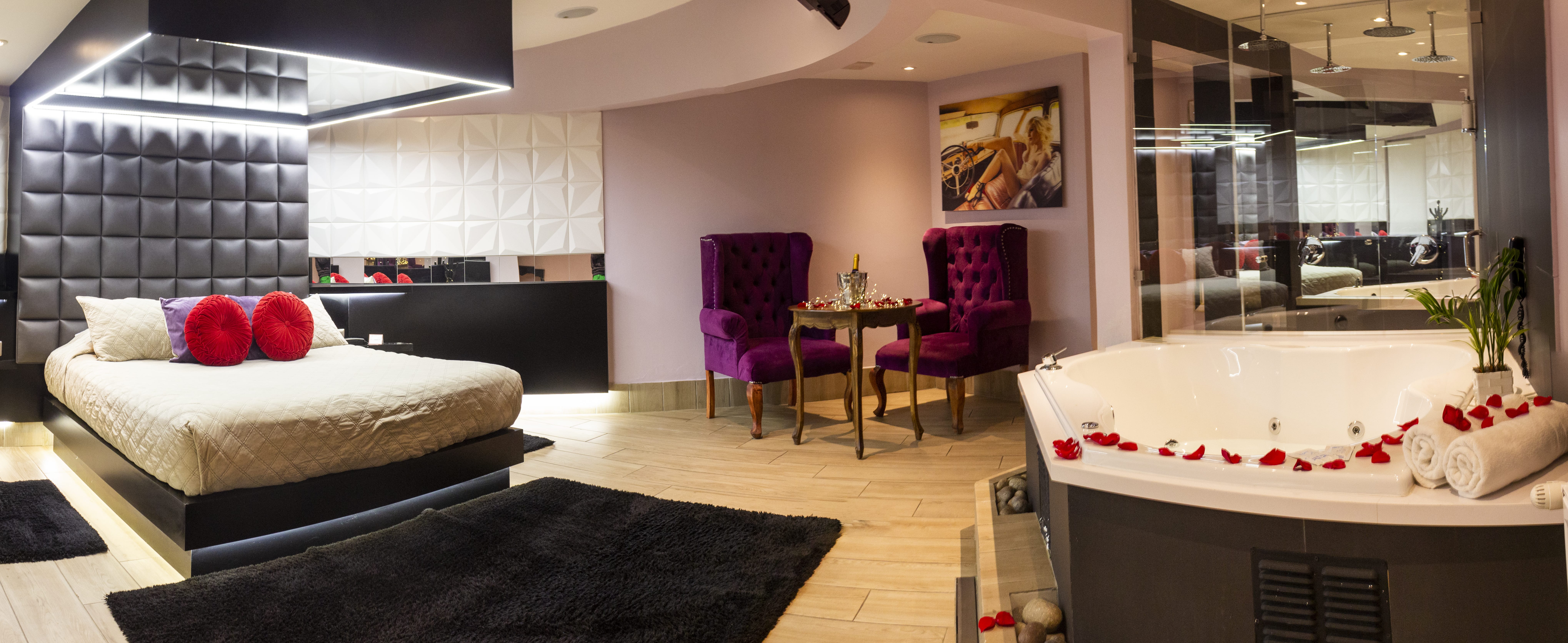 Jacuzzi para 3 personas con luces de colores led subacuáticas. La tercera persona paga un adicional. Estacionamiento privado por habitación Sistema de audio 5.1 con SubWoofer y 4 parlantes conectados a la TV para disfrutar la música que tú quieras en DirecTV Premium con canales XXX. Climatización y Wifi en todas nuestras habitaciones. Diseño exclusivo en donde se utilizaron materiales de construcción completamente lavables orientados a lograr la máxima limpieza e higiene.