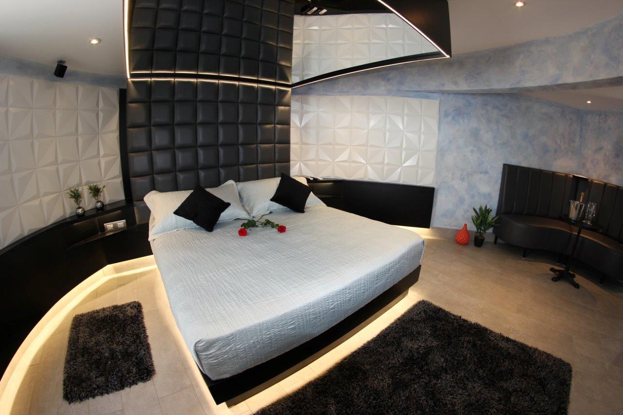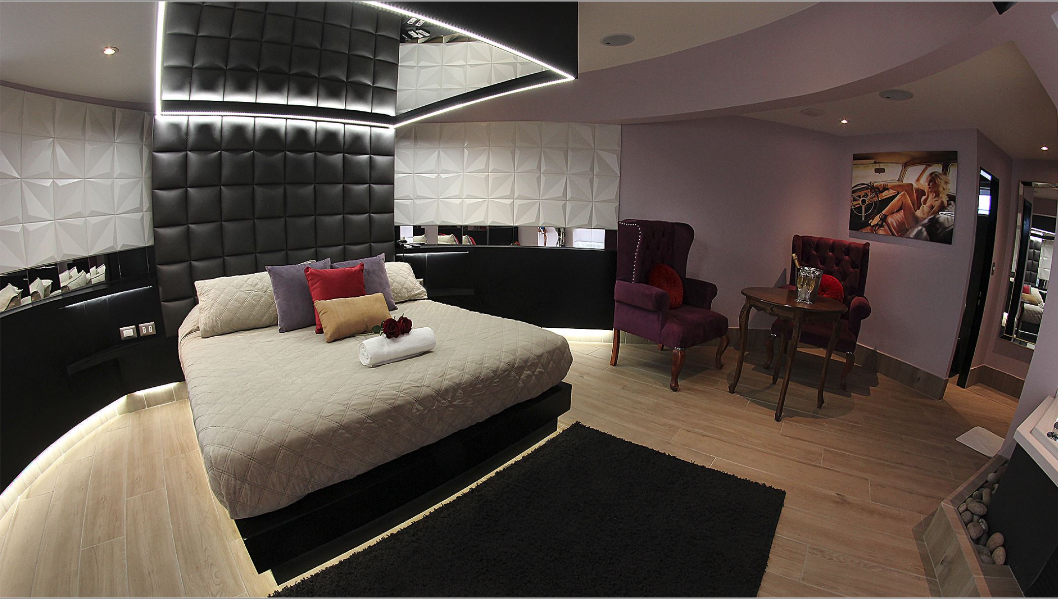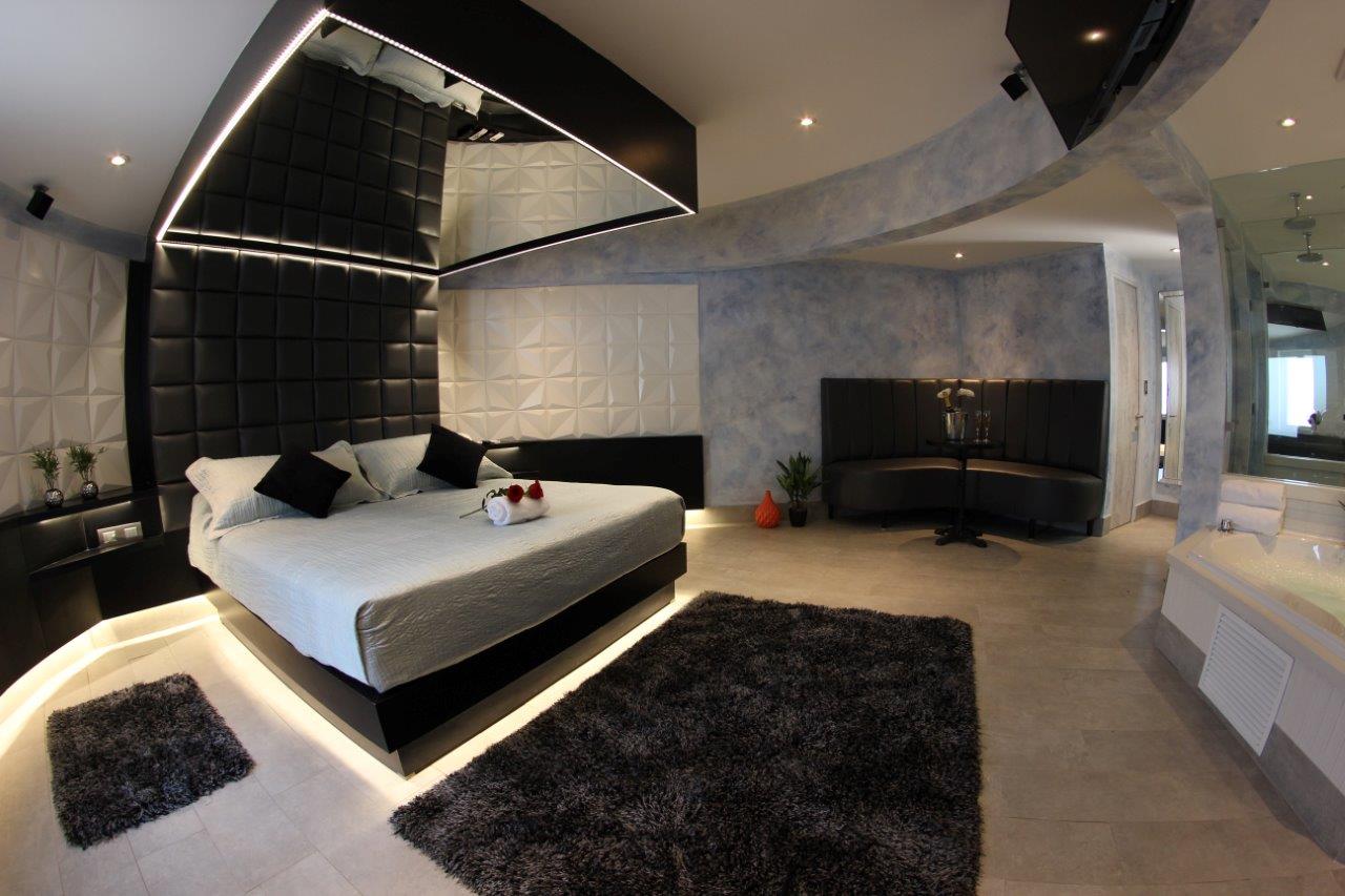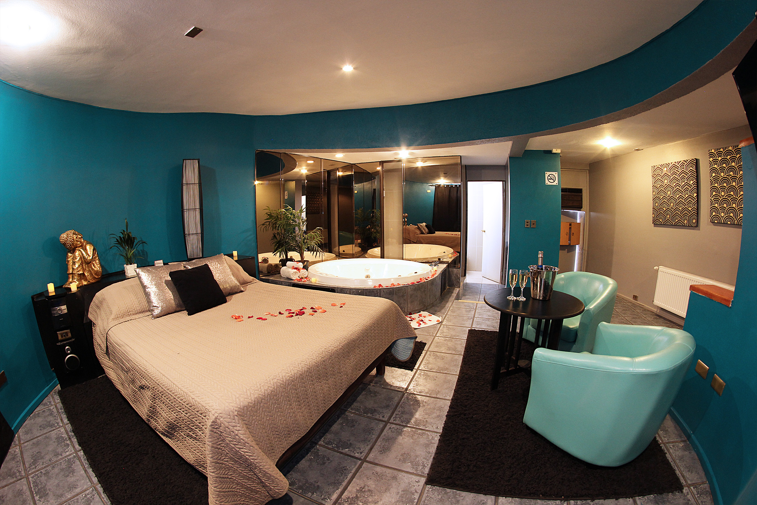 Jacuzzi para 3 personas con luces de colores led subacuáticas. La tercera persona paga un adicional. Estacionamiento privado por habitación Sistema de audio 5.1 con SubWoofer y 4 parlantes conectados a la TV para disfrutar la música que tú quieras en DirecTV Premium con canales XXX. Climatización y Wifi en todas nuestras habitaciones. Diseño exclusivo en donde se utilizaron materiales de construcción completamente lavables orientados a lograr la máxima limpieza e higiene.