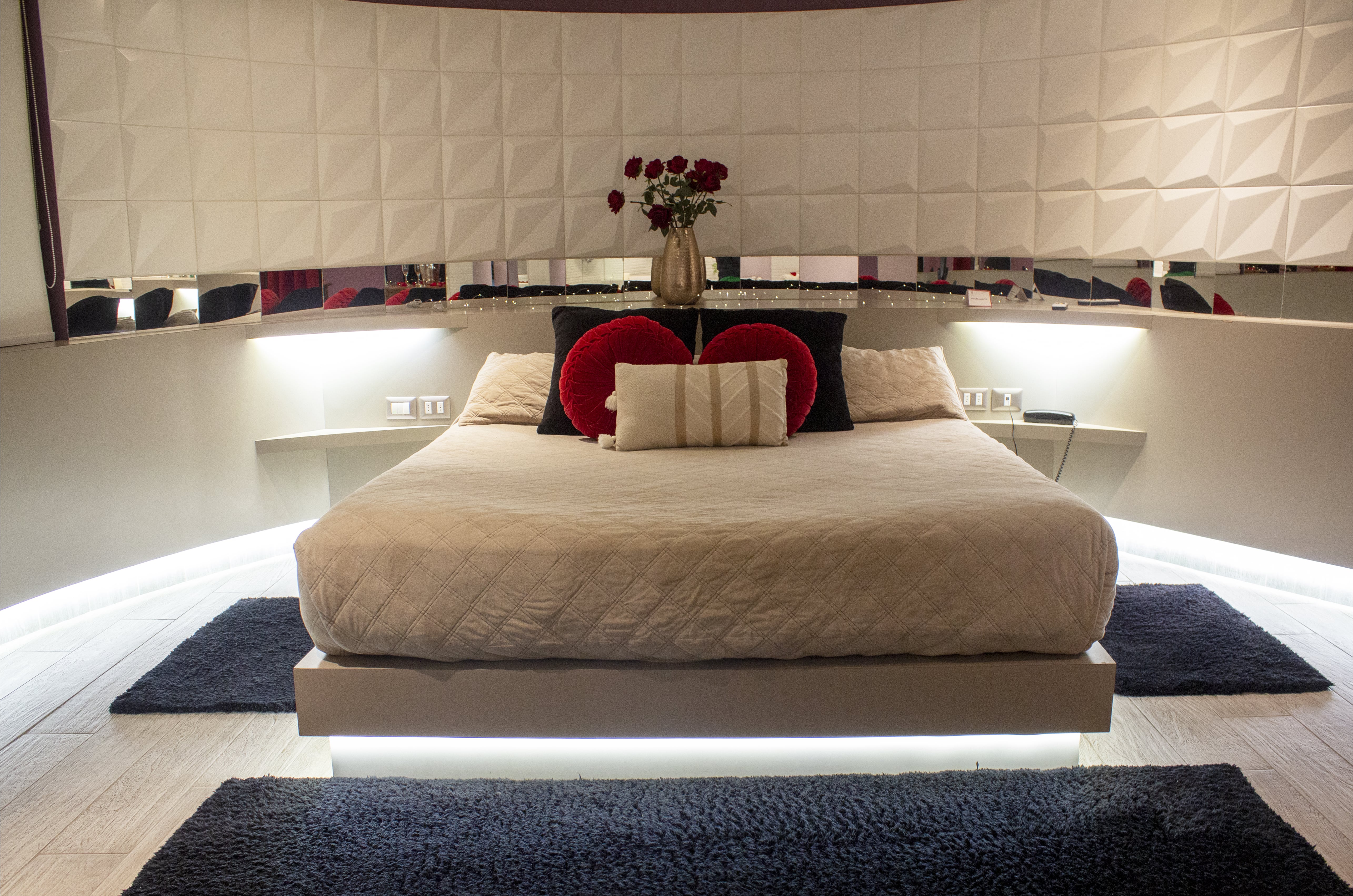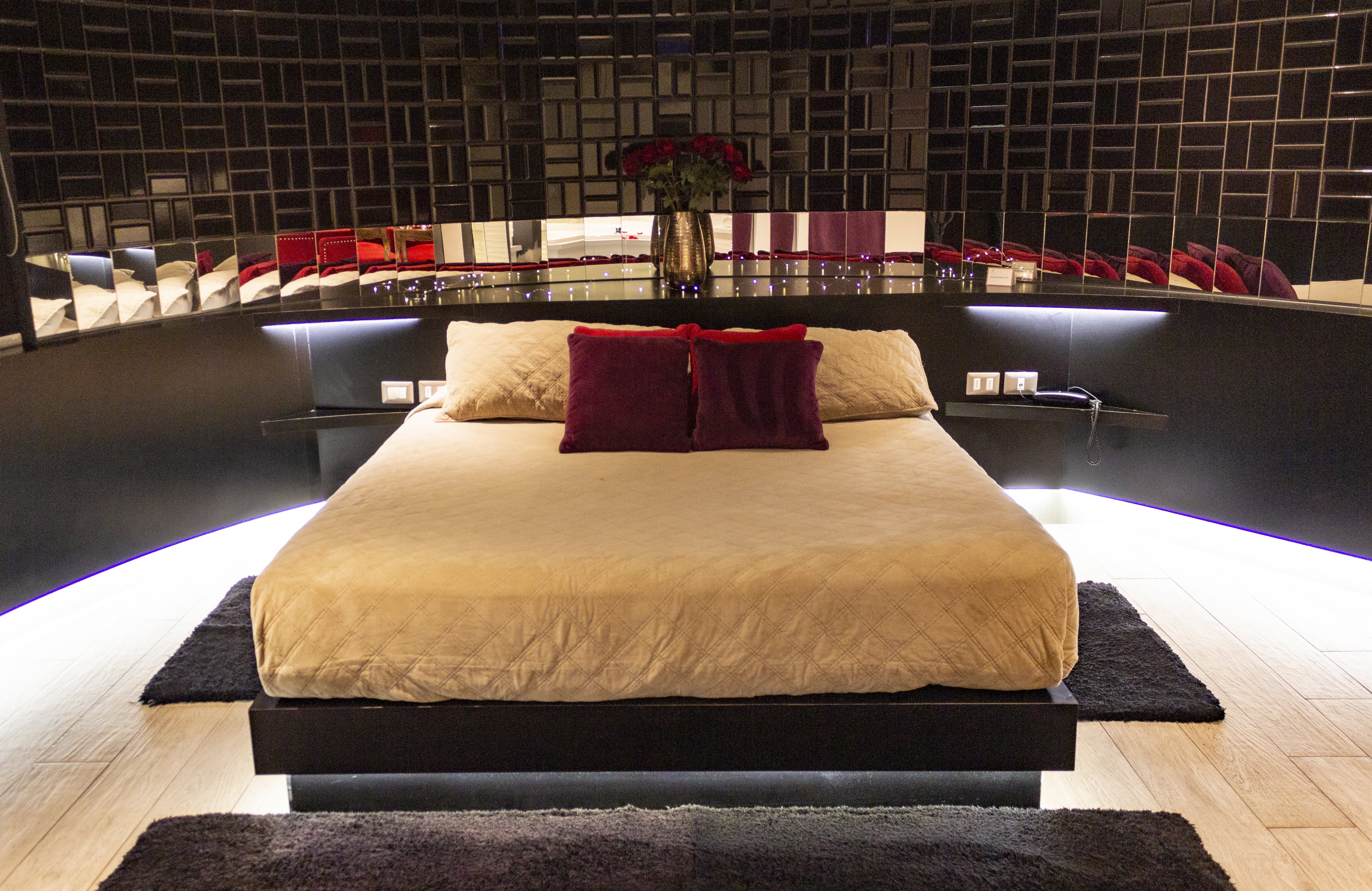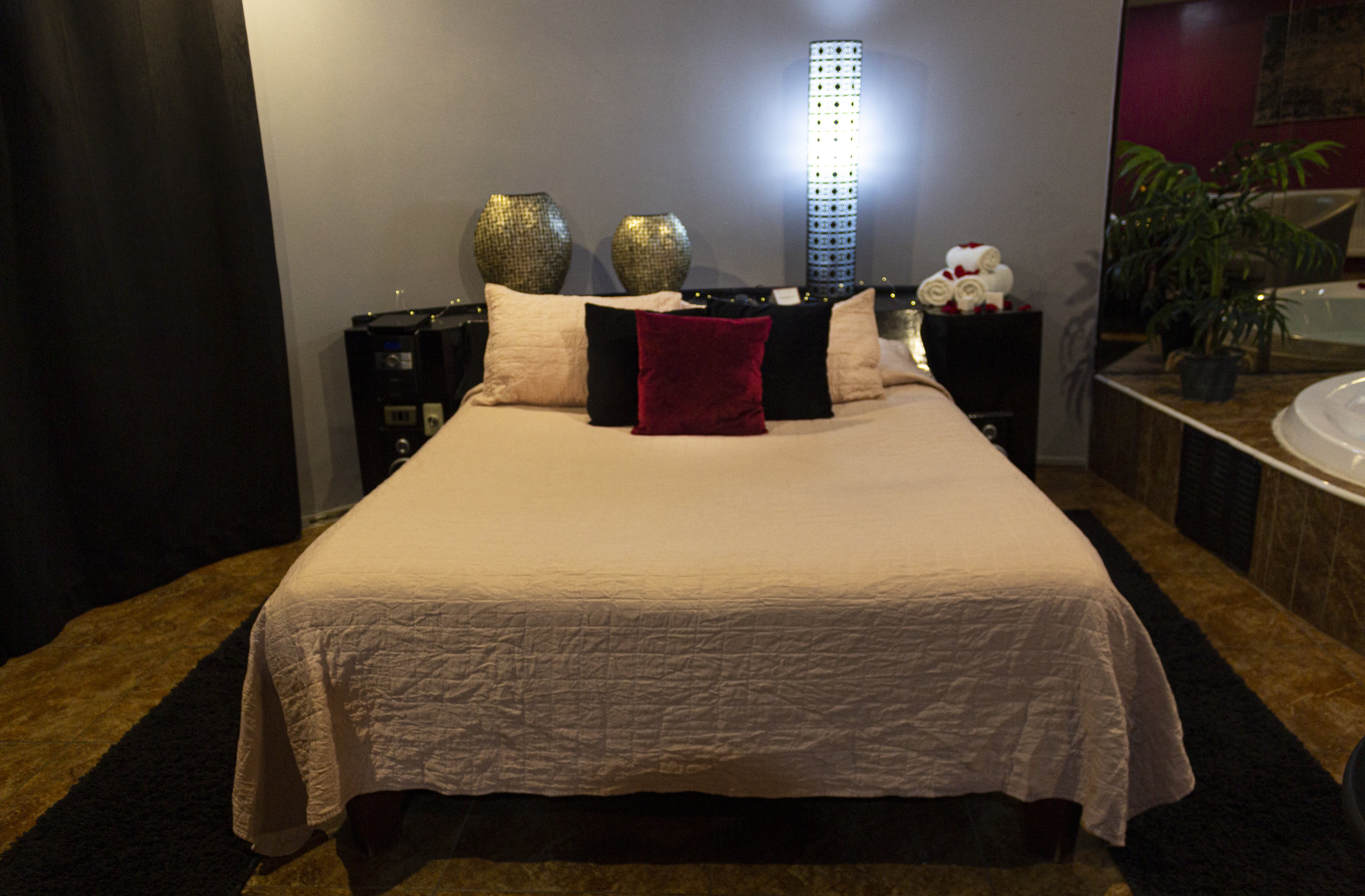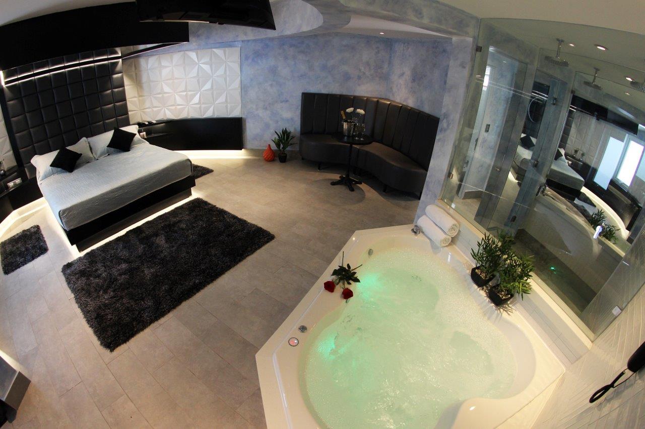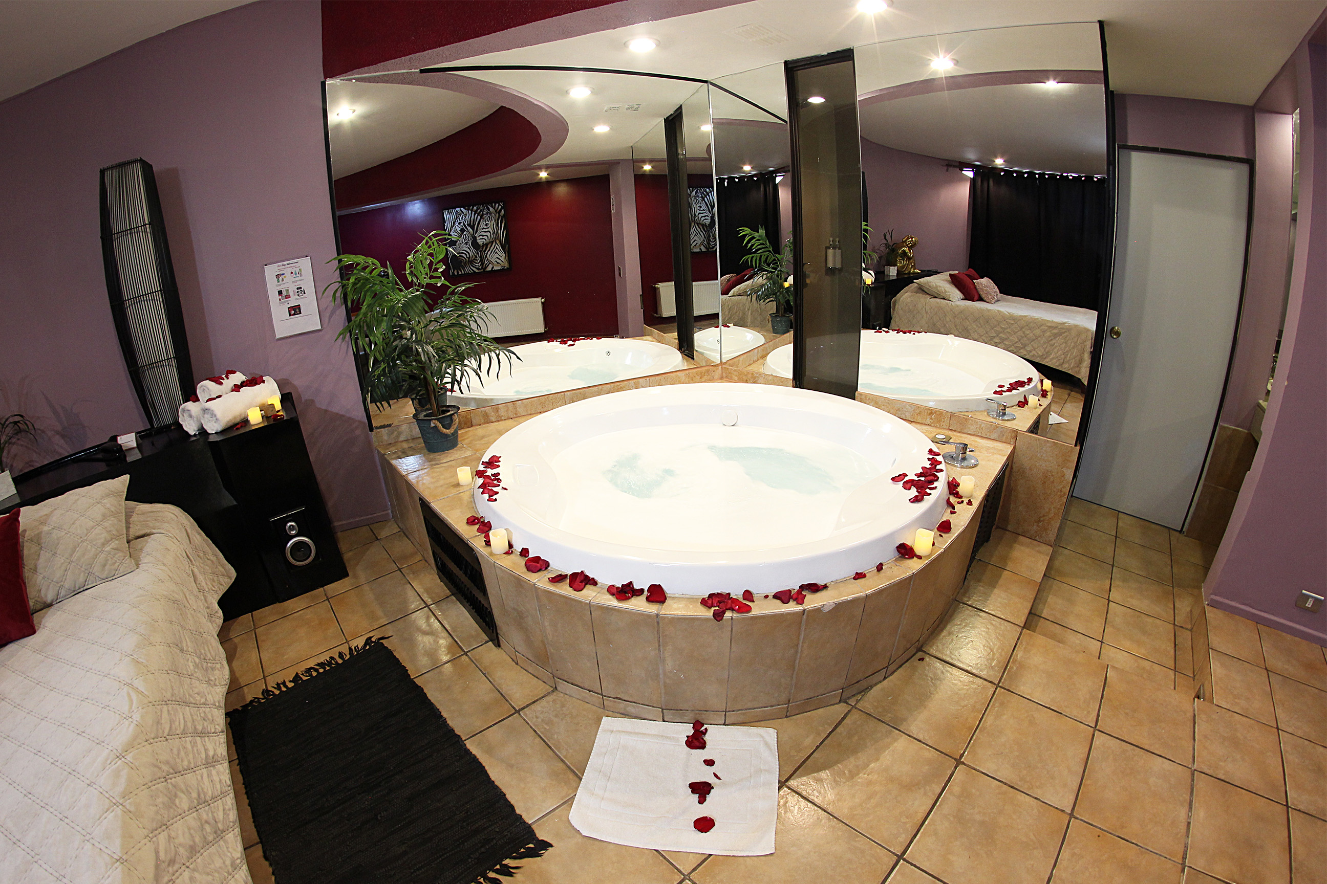 Jacuzzi para 3 personas con luces de colores led subacuáticas. La tercera persona paga un adicional. Estacionamiento privado por habitación Sistema de audio 5.1 con SubWoofer y 4 parlantes conectados a la TV para disfrutar la música que tú quieras en DirecTV Premium con canales XXX. Climatización y Wifi en todas nuestras habitaciones. Diseño exclusivo en donde se utilizaron materiales de construcción completamente lavables orientados a lograr la máxima limpieza e higiene.