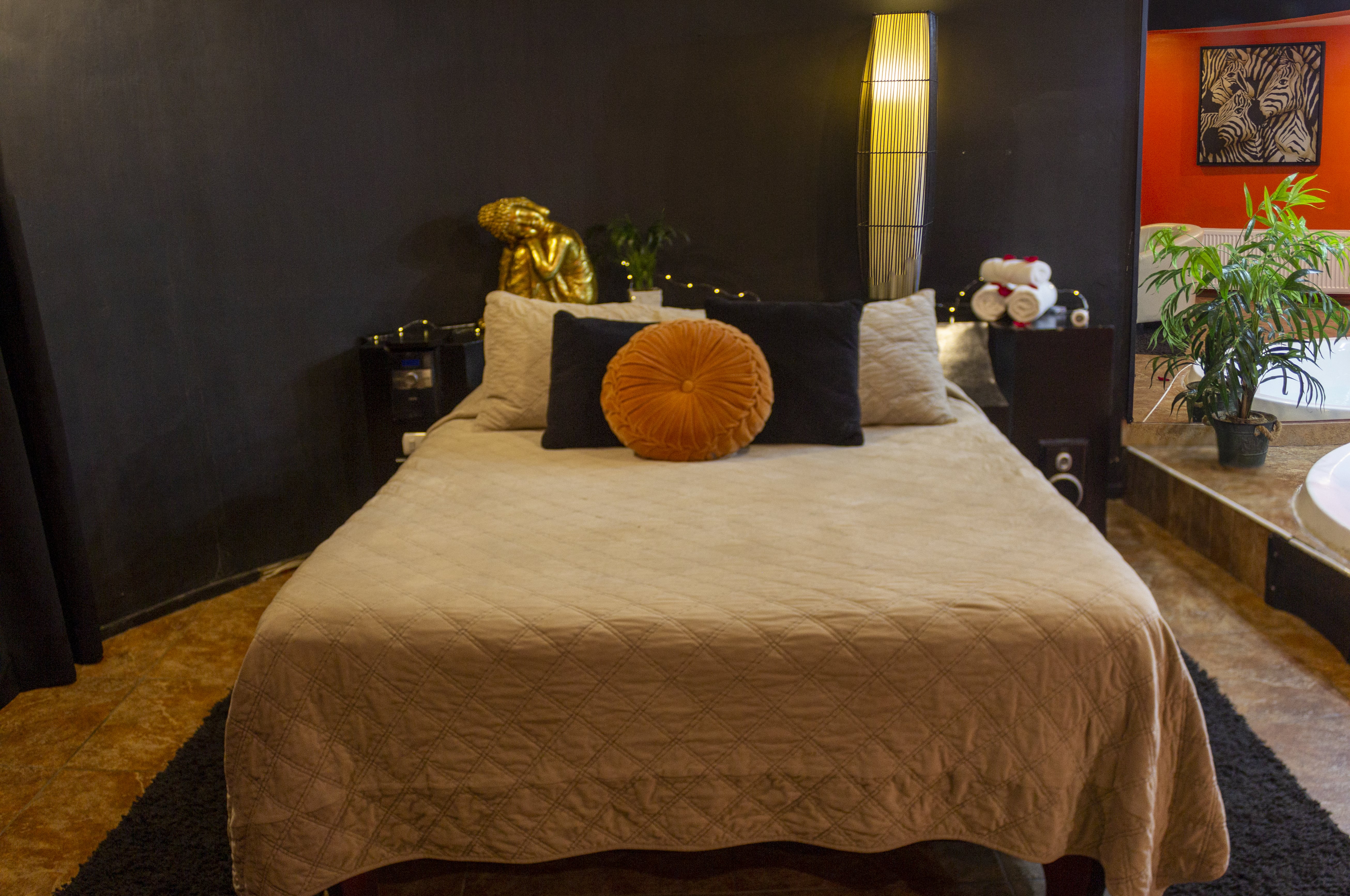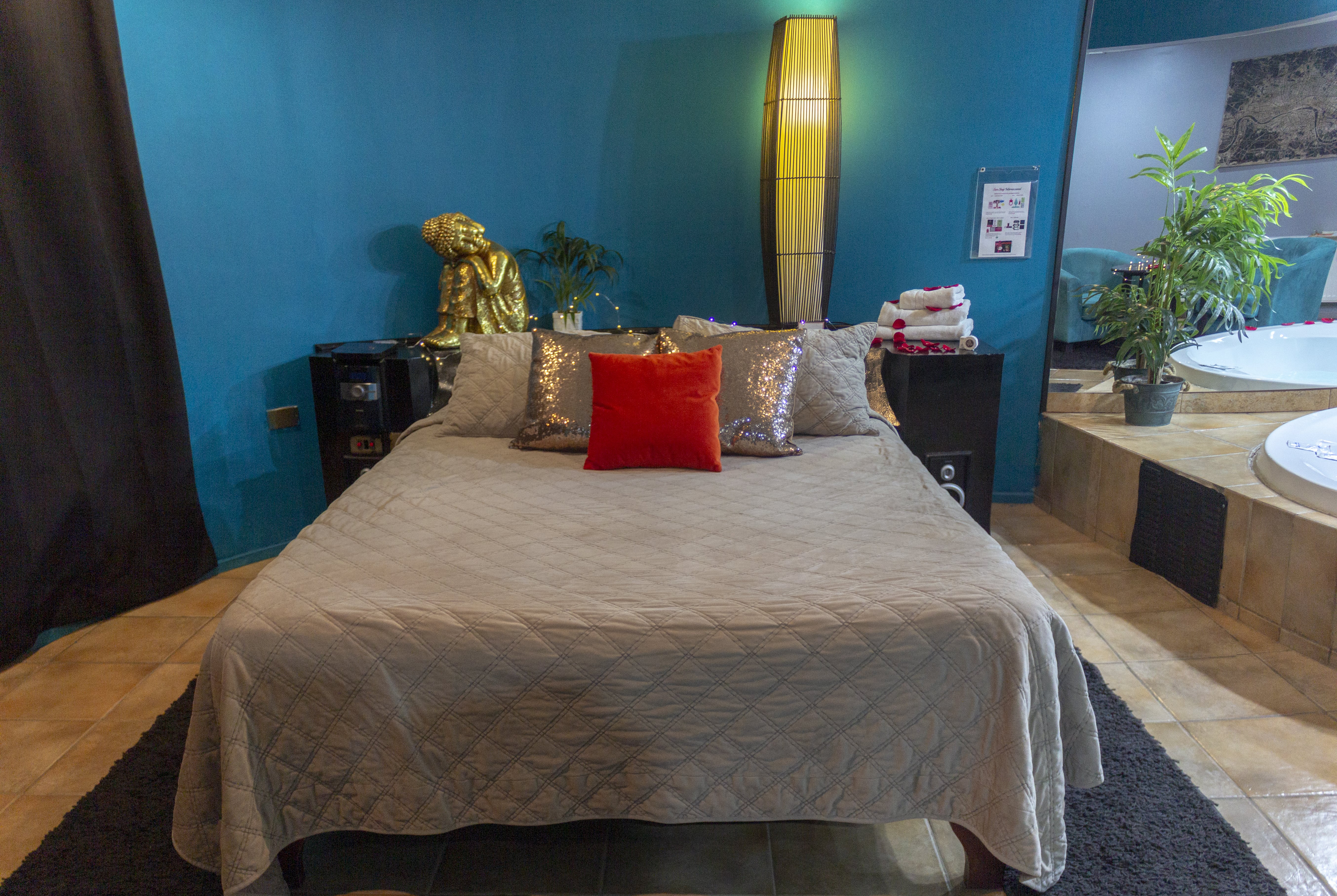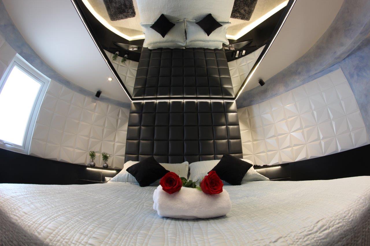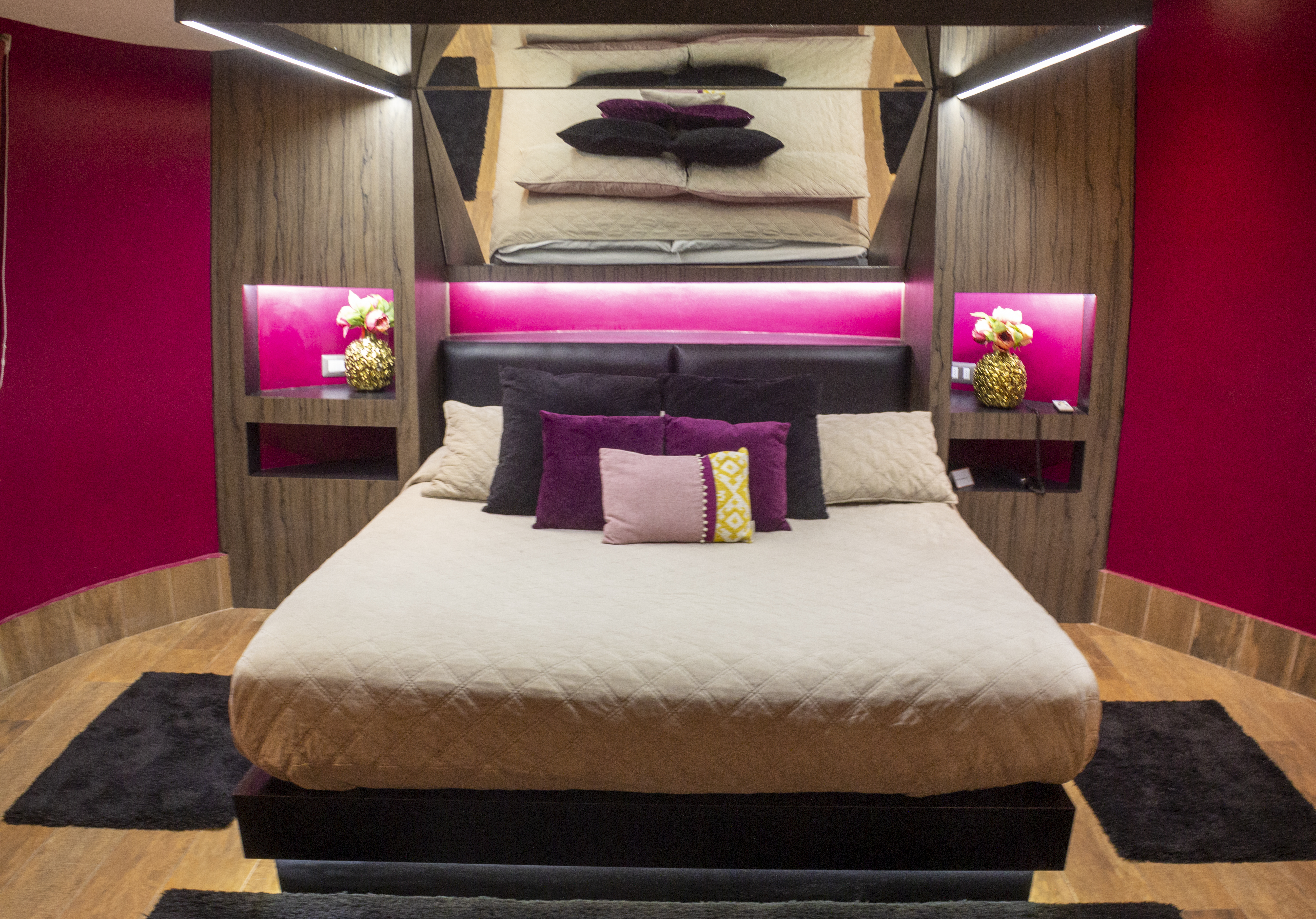 Jacuzzi para 3 personas con luces de colores led subacuáticas. La tercera persona paga un adicional. Estacionamiento privado por habitación Sistema de audio 5.1 con SubWoofer y 4 parlantes conectados a la TV para disfrutar la música que tú quieras en DirecTV Premium con canales XXX. Climatización y Wifi en todas nuestras habitaciones. Diseño exclusivo en donde se utilizaron materiales de construcción completamente lavables orientados a lograr la máxima limpieza e higiene.
